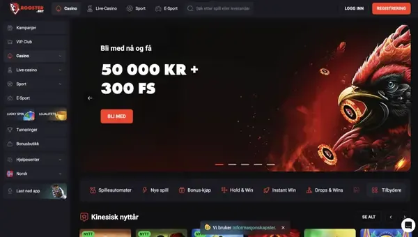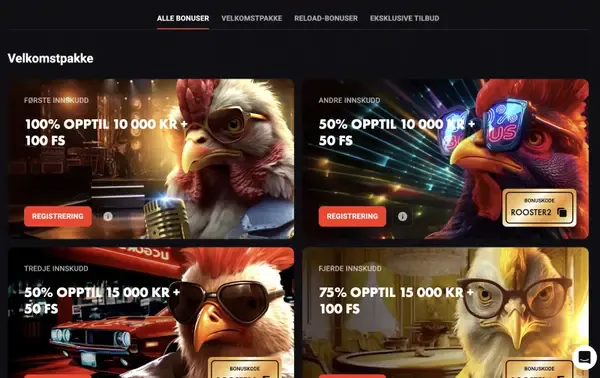 Vi deltar også i Pragmatic Play Drops & Wins, en global turnering med månedlige premiepotter på utvalgte spilleautomater og live casino-titler. Fra tid til annen spør spillere om en RoosterBet casino bonus uten innskudd; for øyeblikket lister vi ikke en bonus uten innskudd som et standardtilbud. I stedet fokuserer vi på innskuddsbaserte avtaler som kan spores i kampanjehistorikken din og i kassen.