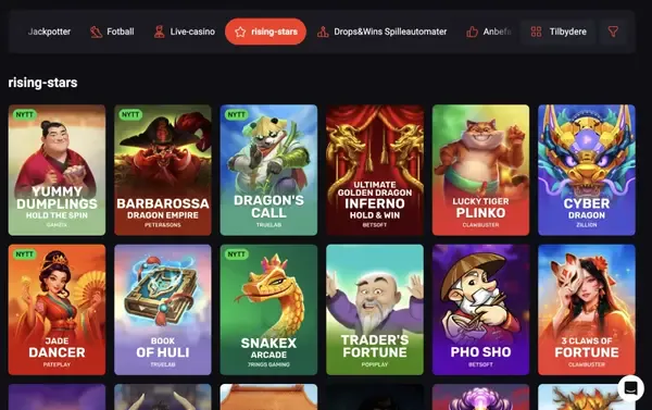 Hos RoosterBet Casino er lobbyen vår laget for at du raskt skal kunne filtrere mellom Spilleautomater, Bordspill, Live Casino, Jackpotspill, Sportsbok, Instant Win og Crash-spill. Vi har for øyeblikket 10 000 spill, med kjente studioer som Pragmatic Play, Evolution, Play’n GO, NetEnt, BGaming, Nolimit City, Betsoft, Yggdrasil, Wazdan og Spinomenal. Når du spiller hos RoosterBet, kan du sortere etter leverandør, spilltype og nye lanseringer, og du kan også søke på navn.